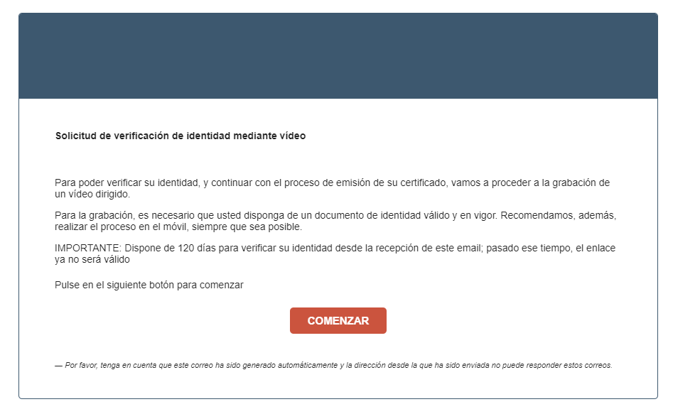 To verify your identity and obtain your digital certificate, you must complete a video identification process. This process consists of capturing an image of your identity document and recording a video using a mobile device equipped with a camera, microphone, and Internet connection.