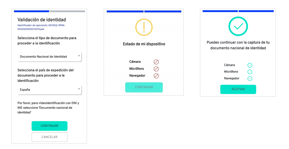 Select the type of document you will use for identification and the country where it was issued. Select the type of document you will present from the drop-down menu. For DNI and NIE with a photo (TIE), select “National Identity Document”. Choose the issuing country of your document from the drop-down menu. After clicking Continue, the system will request permission to access your camera and microphone. Once both indicators appear in green, proceed by clicking Accept.